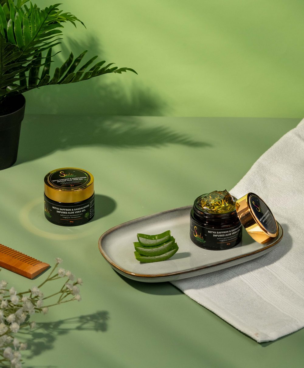 Nitya Saffron & Sandalwood Infused Aloe Vera Gel is powerhouse of natural ingredients for your skin. It combines the goodness of Aloe Vera, Kashmiri Saffron, and Sandalwood Oil to deliver remarkable benefits such as lightening the skin and hydrating it sufficiently. Sandalwood Oil in the formulation helps regulate sebum secretion, promoting balanced and lighter pores. Enriched with Aloe Vera, this gel contains essential vitamins, including A, C, E, and B12, folic acid, enzymes, and minerals to enhance skin complexion and reduce